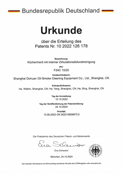 熱量祝賀上海多環(huán)公司內(nèi)循環(huán)式油煙凈化灶體技術(shù)獲得德國(guó)發(fā)明專利